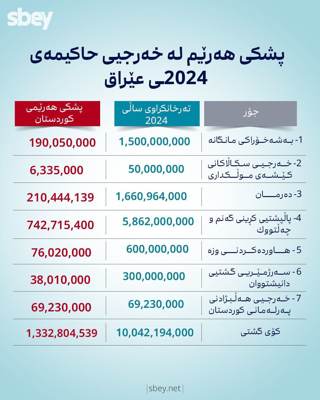 خشتەی بودجەی ساڵی 2024ـی عێراق بڵاوکرایەوە، پشکی هەرێمی کوردستان کۆی گشتی بودجەی هەرێمی کوردستان بە 20 تریلیۆن و 910 ملیار و 463 ملیۆن و 950 هەزار دینار دیاریکراوە.