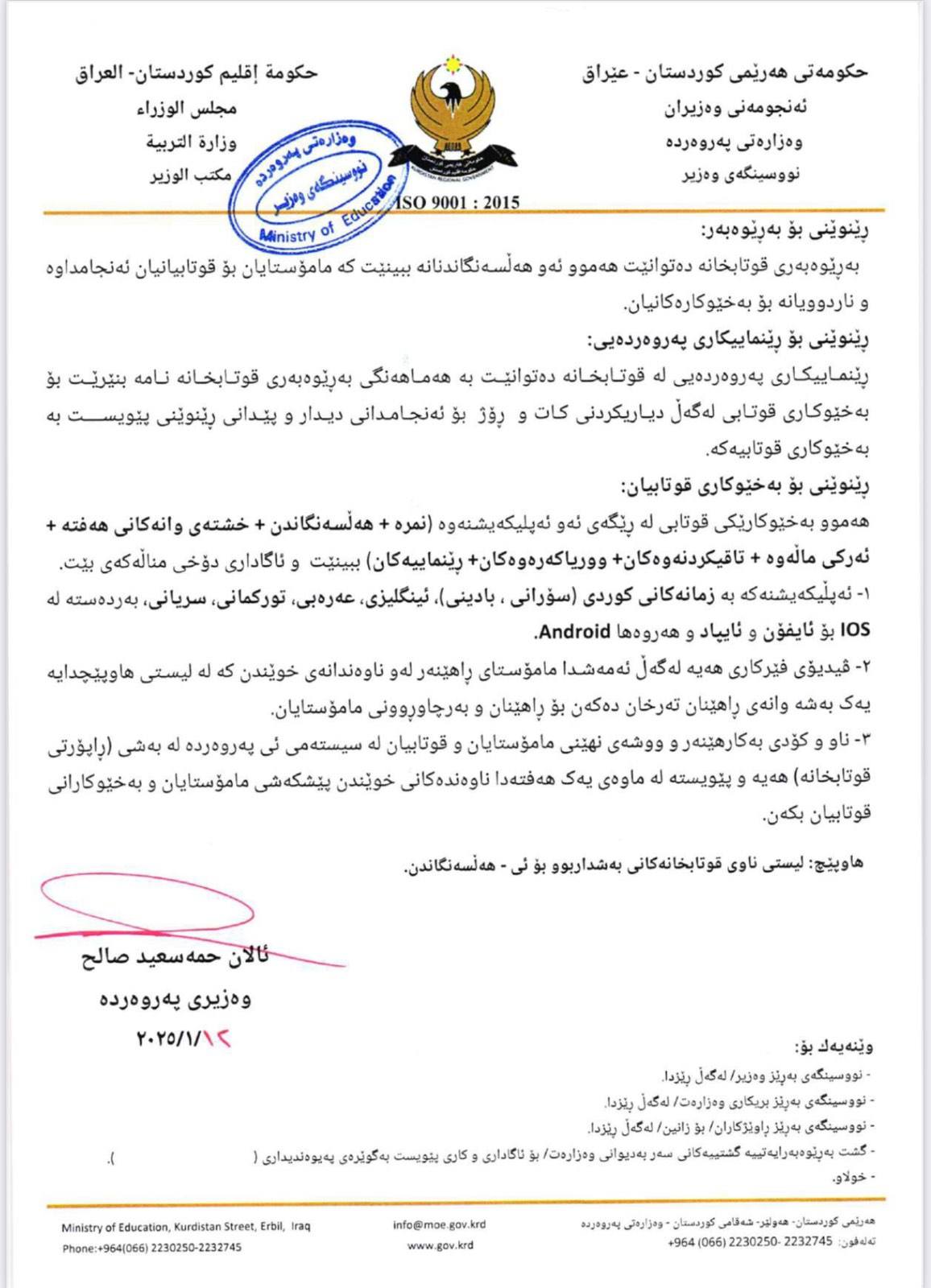 وەزارەتی پهروهردهی هەرێم خزمەتگوزارییەکی دیجیتاڵی نوێی بۆ کەرتی پەروەردە راگەیاند، کە لە سەرەتای وەزری دوەمی ئەمساڵی خوێندنەوە (2024-2025) دەكەوێتە بواری جێبەجێكردنەوە، تیادا لەڕێگەی ئەپڵیکەیشنێکەو دایکان و باوکان دەتوانن ئاگاداری وانەکان و نمرەی خوێندکارەکانیان بن.