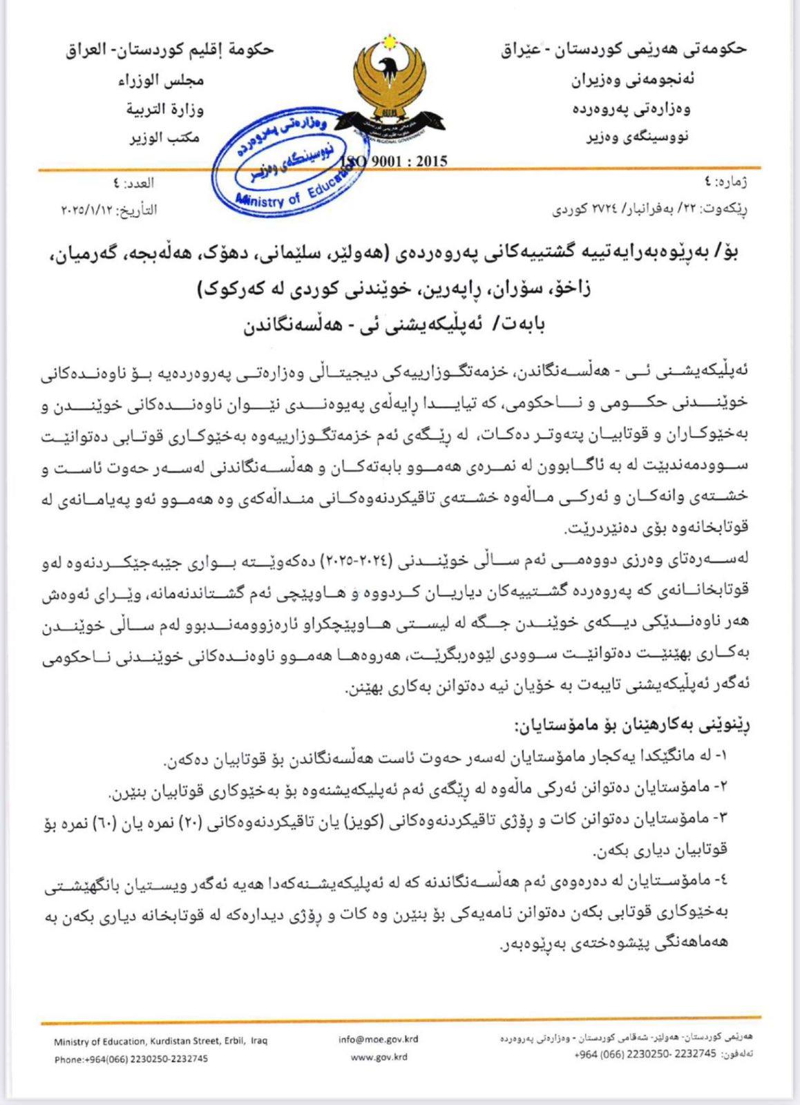 وەزیری پەروەردەی حکومەتی هەرێمی کوردستان رایگەیاند: لەوەرزی دووەمی خوێندنەوە لە 396 قوتابخانەی حکومی بەکاردەهێندرێت و قوتابخانەکانی دیکەی حکومی و ناحکومیش دەتوانن بەکاریبهێنن.