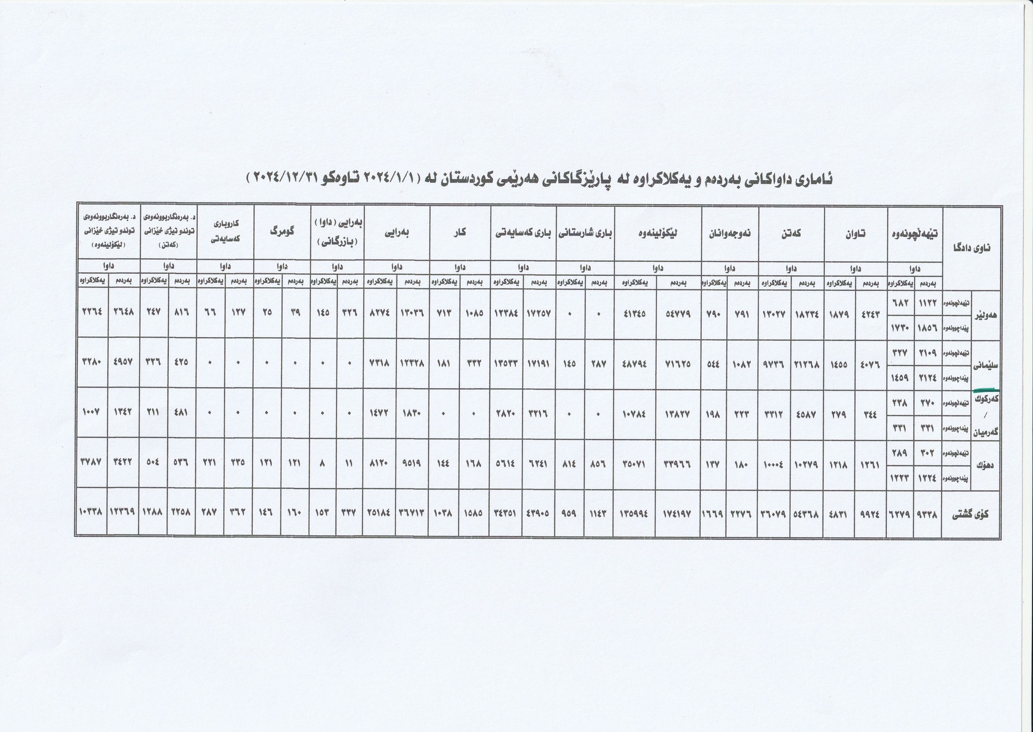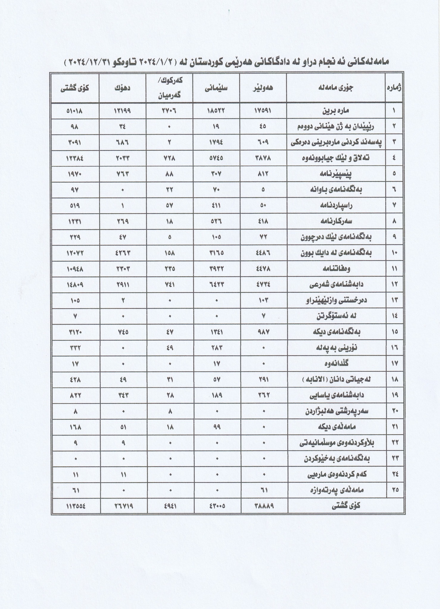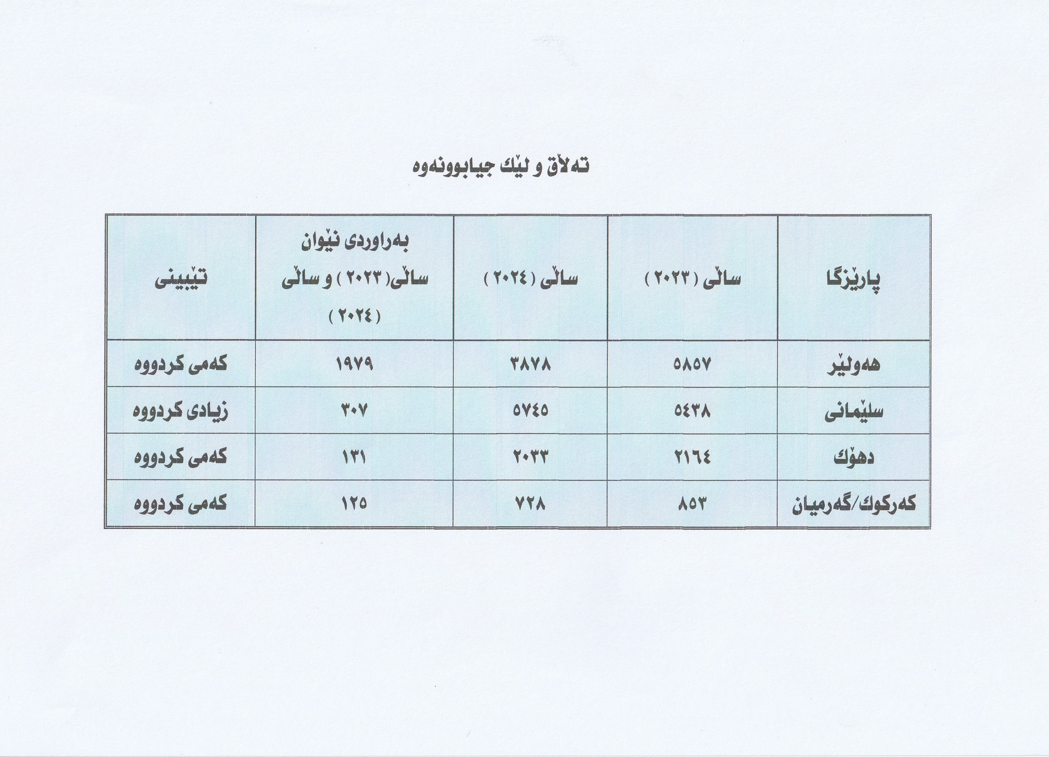 بەپێی ئامارەکانی ئەنجوومەنی دادوەری هەرێمی کوردستان بۆ ساڵی 2024 لە شارەکانی هەولێر، سلێمانی، دهۆک و گەرمیان بەم شێوەیەیە کە لە هەولێر زیادی کردووە و لە سلێمانی کەمی کردووە؛