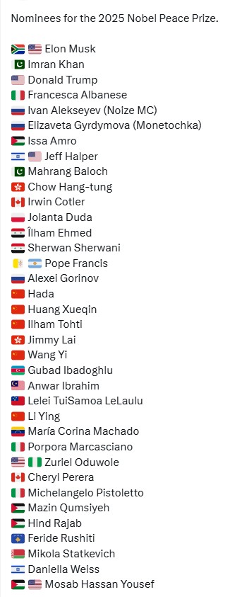بەپێی ئەو زانیارییانە لە ژمارەیەک لاپەڕی تۆڕە کۆمەڵایەتییەکانی فەیسبووک و ئێکس بڵاوکراونەتەوە، هەریەک لە ئیلهام ئەحمەد و شێروان شێروانی وەک دوو کەسایەتی کاریگەری ساڵ پاڵێوراون بۆ وەرگرتنی خەڵاتی نۆبڵی ئاشتی 2025.