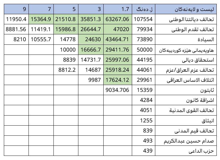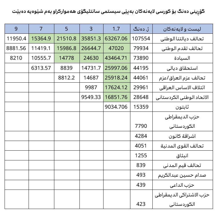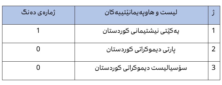 لەم بارەدا ئەگەر هێزە کوردییەکان بە لیستى جیا بەشداریی بکەن ئەوا چانسی بردنەوەى یەک کورسی دەبێت، بەم شێوەیە: