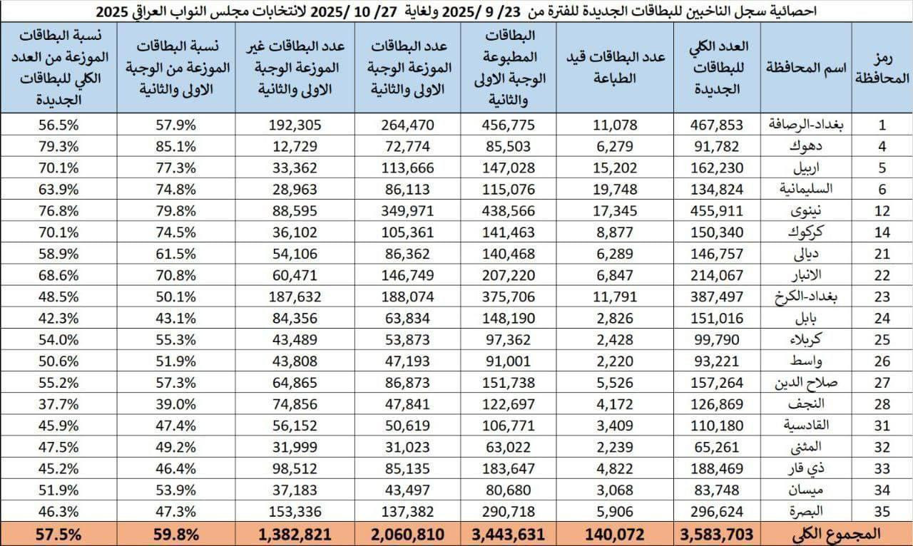 کۆمسیۆنى باڵاى سەربەخۆى هەڵبژاردنەکانى عێراق دابەشکردنى زیاتر لە 57%ى کارتە نوێیەکانى دەنگدانى راگەیاند و پارێزگاى دهۆک لە پلەى یەکەمدایە بە دابەشکردنى 79.3%ى کارتەکان.