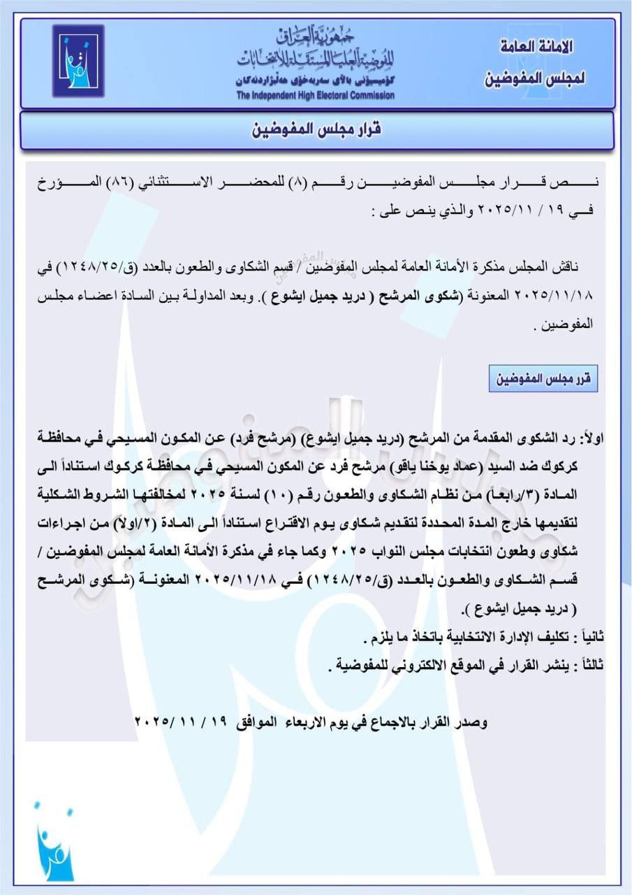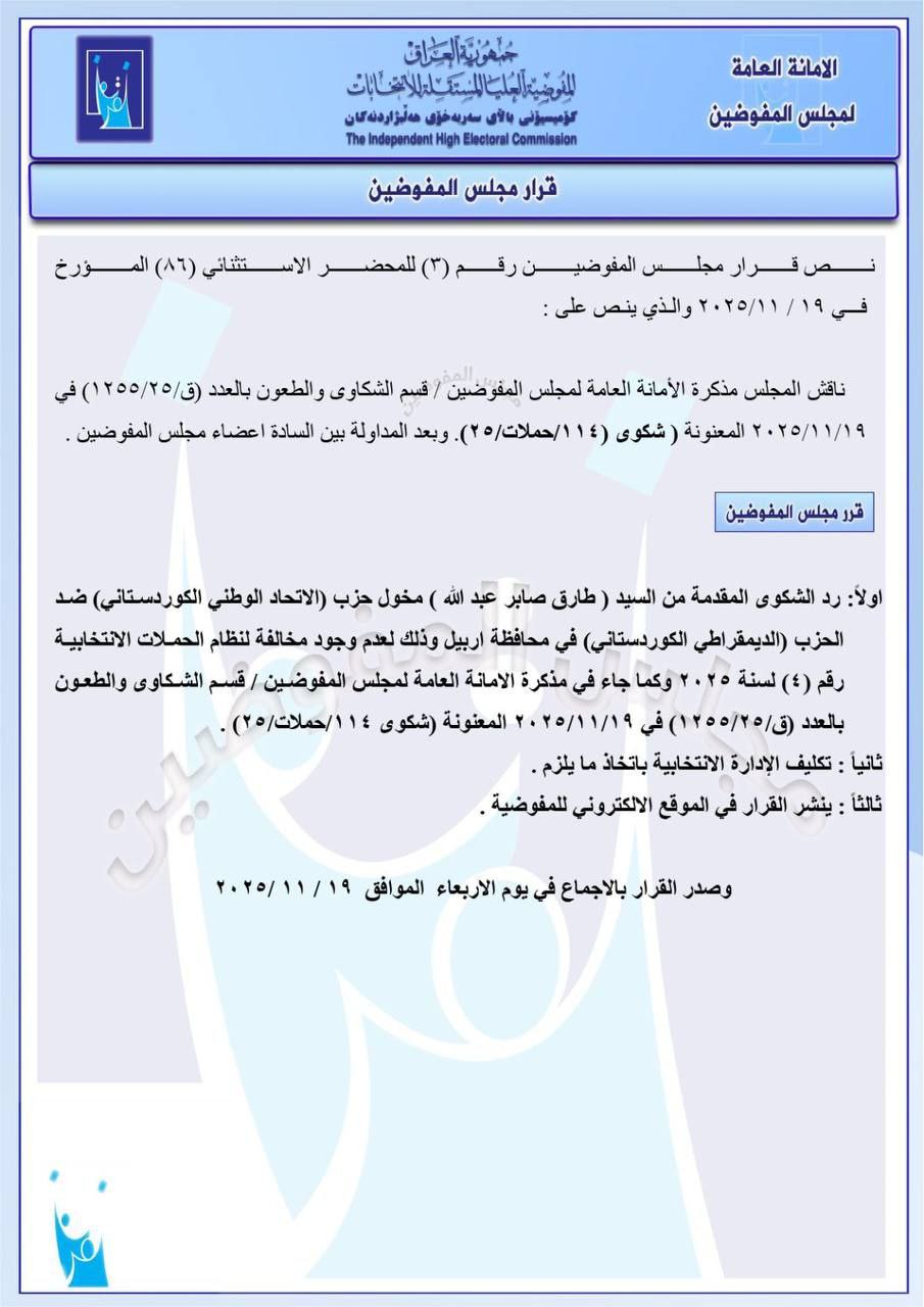 ئەمڕۆ چوارشەممە (19ـی تشرینی دووەمی 2025) ئەنجومەنی کۆمسیارانی کۆمسیۆنی باڵای هەڵبژاردنەکانی عێراق، سکاڵایەکی تارق سابر عەبدوڵڵا رێپێدراوی پارتی دیموکراتی کوردستانی لەسەر یەکێتی نیشتیمانی کوردستان رەتکردەوە، کە لە سنوری پارێزگای هەولێر و لەکاتی بانگەشەی هەڵبژاردن لەسەری تۆماری کردبوو.