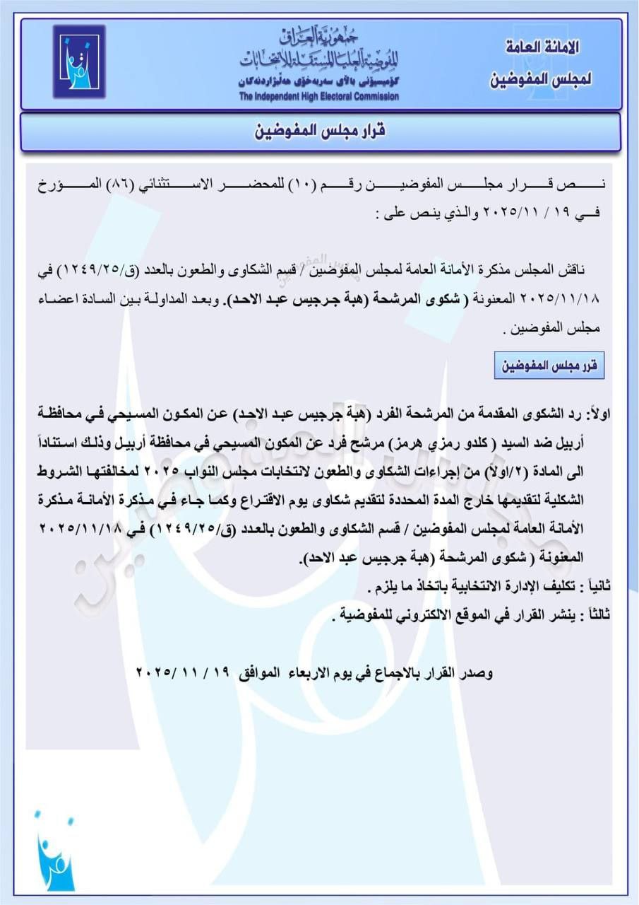 هەر ئەمڕۆ چوارشەممە، کۆمسیۆنی باڵای هەڵبژاردنەکانی عێراق سکاڵایەکی دیکەی هیبە جەرجیس عەبد ئەحەد، کاندیدی مەسیحییەکانی لە سنوری پارێزگای هەولێر لەسەر کلدۆ رەمزی هورمز، کاندیدی سەرکەوتووی پارتی دیموکراتی کوردستان لە هەولێر رەتکردەوە، بەهۆی ئەوەی مەرجەکانی تێدا نەبووە و لە ماوەی دیاریکراوی خۆی بۆ تۆمارکردنی سکاڵاکان تۆمار نەکراوە.