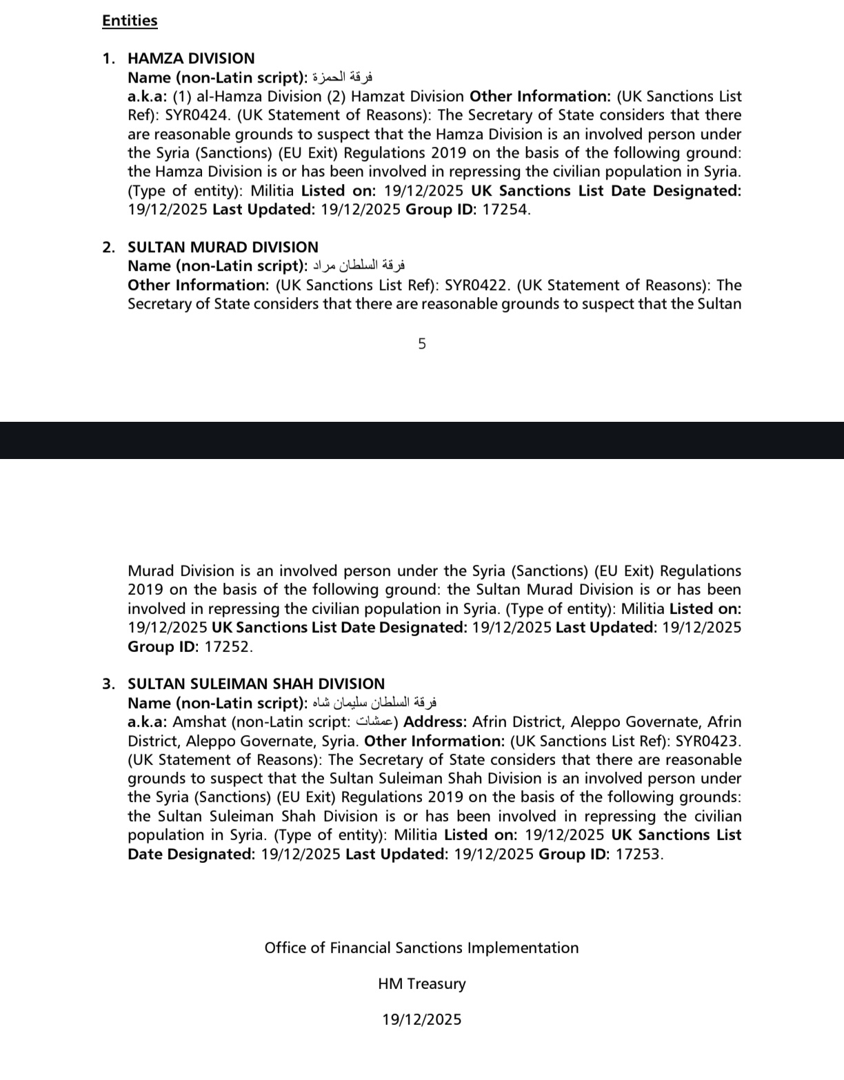 هەروەها سزاکان فیرقەی سوڵتان موراد و فیرقەی سوڵتان سلێمان شا و فیرقەی حەمزەى گرتووەتەوە، لەگەڵ چەند کەسێک کە یارمەتى داراییان پێشکەشى رژێمى ئەسەد کردووە.