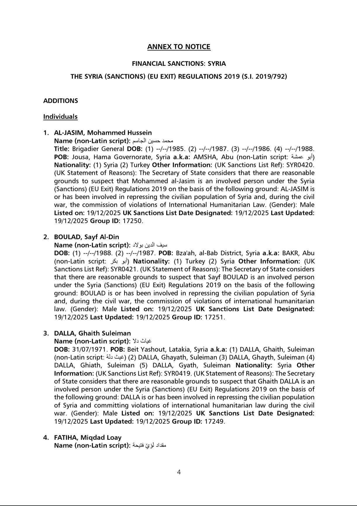 سزاکانی بەریتانیا محەمەد جاسم (ئەبو عەمشە) فەرماندەی فیرقەی ٢٥ی ئێستای سوپای سوریا و فەرماندەی فیرقەی سوڵتان سلێمان شا و هەروەها سەیفەدین بولاد فەرماندەی لیوای ٧٦ و فیرقەی حەمزەی کردووەتە ئامانج.